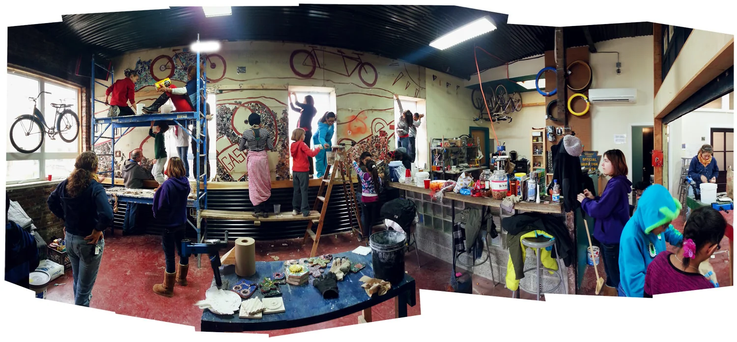 Collaborations were key for the success of this project. We hosted a workshop for the mosaic students at Orange Korner Arts and the youth involved at Simple Cycle to create tiles to be used in the mosaic. This created an opportunity for a unique collaboration: two very different groups of kids from the same neighborhood working together around the table to do something good for their community. Additionally, two organizations chose ours to be their MLK Day of Service Project.
